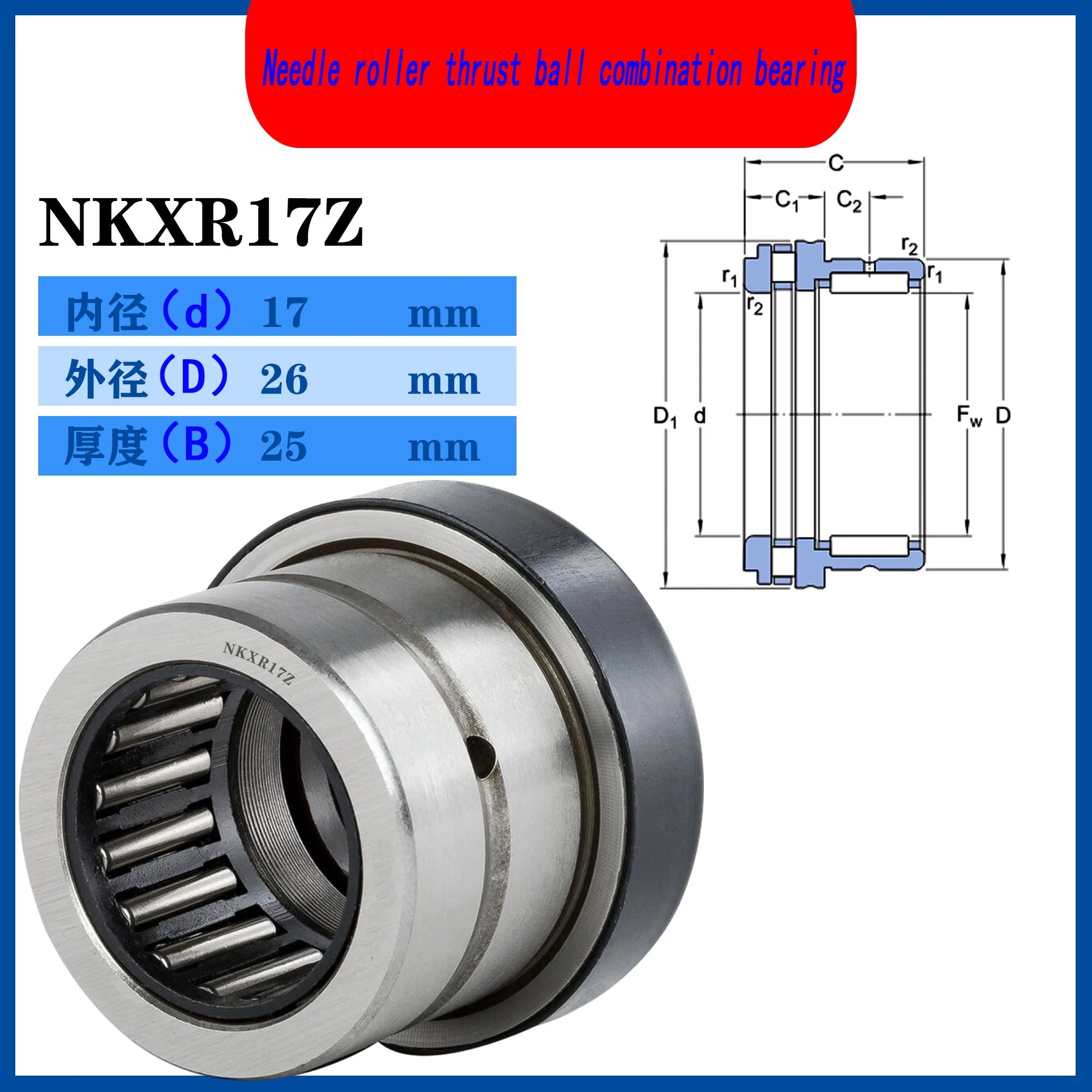 WZZG needle roller / cylindrical roller thrust bearings in the NKXR .. Z series are nonseparable. They have a stamped steel cover that extends over the shaft washer of the cylindrical roller thrust bearing. It is firmly attached to the housing washer that is integral to the needle roller bearing outer ring. The cover makes these bearings non-separable. WZZG supplies the cylindrical roller thrust bearing in this series filled, as standard, with a high-quality grease that has good rust inhibiting properties. The cover, which has no lubrication holes, forms a gap-type seal with the shaft washer to retain the grease in the bearing.