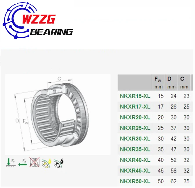 WZZG needle roller / cylindrical roller thrust bearings in the NKXR .. Z series are nonseparable. They have a stamped steel cover that extends over the shaft washer of the cylindrical roller thrust bearing. It is firmly attached to the housing washer that is integral to the needle roller bearing outer ring. The cover makes these bearings non-separable. WZZG supplies the cylindrical roller thrust bearing in this series filled, as standard, with a high-quality grease that has good rust inhibiting properties. The cover, which has no lubrication holes, forms a gap-type seal with the shaft washer to retain the grease in the bearing.